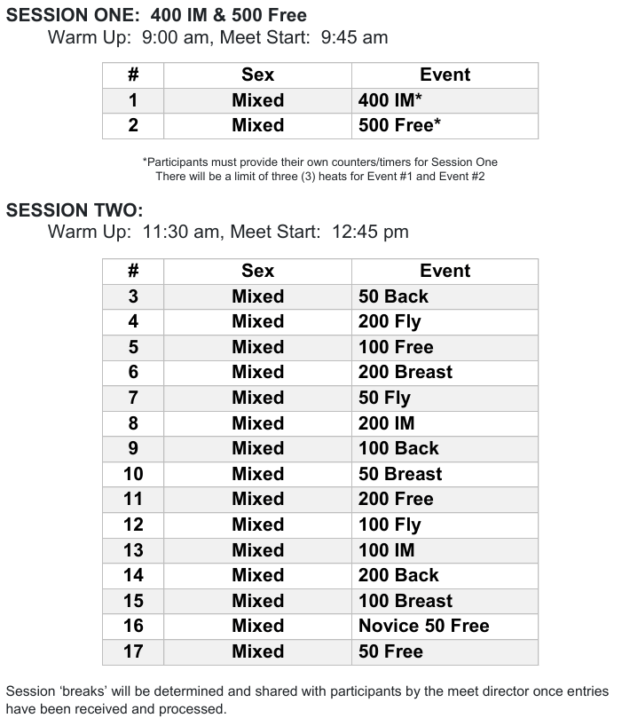 * Times from this competition will be eligible for USMS records and USMS Top-10 consideration in